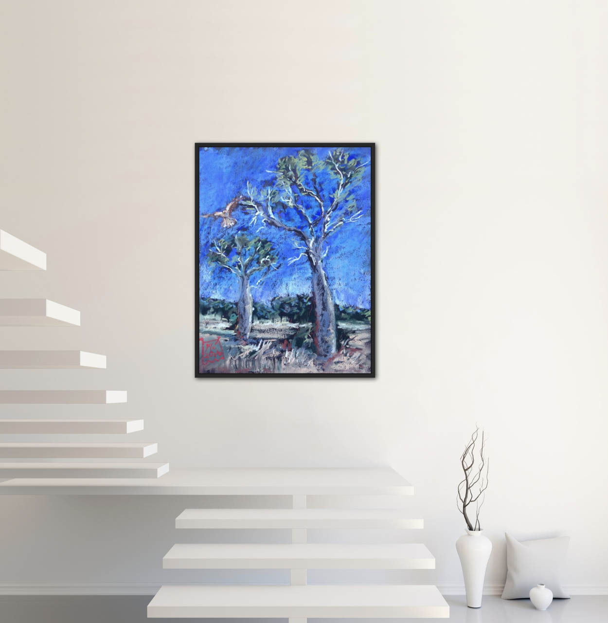 This artwork is currently framed and ready to hang.